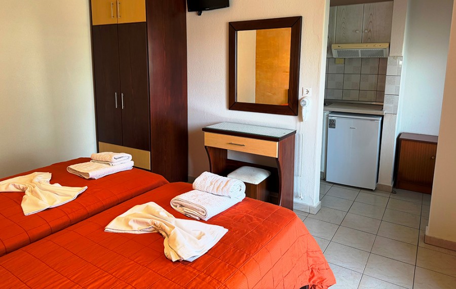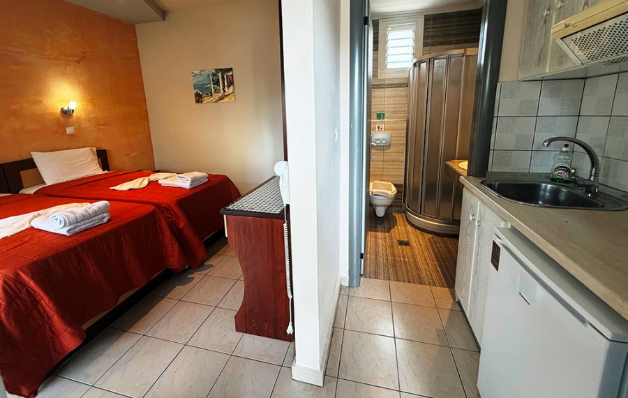 U našoj ponudi su dvokrevetna studija i dvokrevetna studija sa pomoćnim ležajem, smeštenim u prizemlju ili visokom prizemlju. Sva studija imaju opremljen kuhinjski deo, kupatilo, terasu, peškire, WIFI, TV, klima uređaj (uključen u cenu aranžmana), sef (uključen u cenu aranžmana). Vila poseduje bazen i ležaljke u dvorištu pored bazena, pool bar. Dvorište je izuzetno prostrano, ograđeno, uređeno i sa puno zelenila. Moguće je parkirati u neposrednoj blizini vile. Postoji i uslužni toalet. Čišćenje smeštajnih jedinica, promena peškira i posteljine je petog dana boravka.